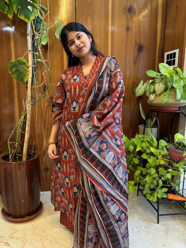 Premium 3 piece kurti set This set features a rich gaji silk base adorned with traditional kalamkari print ,paired with a lightweight chiffon dupatta for an elegant drape