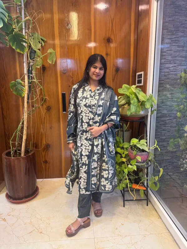 Premium 3 piece kurti set Black and white floral print kurti with a V-neck and 3/4th sleeves,paired with a matching dupatta