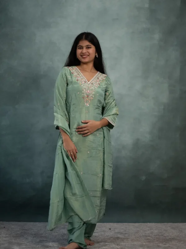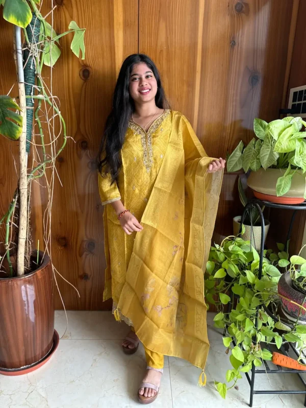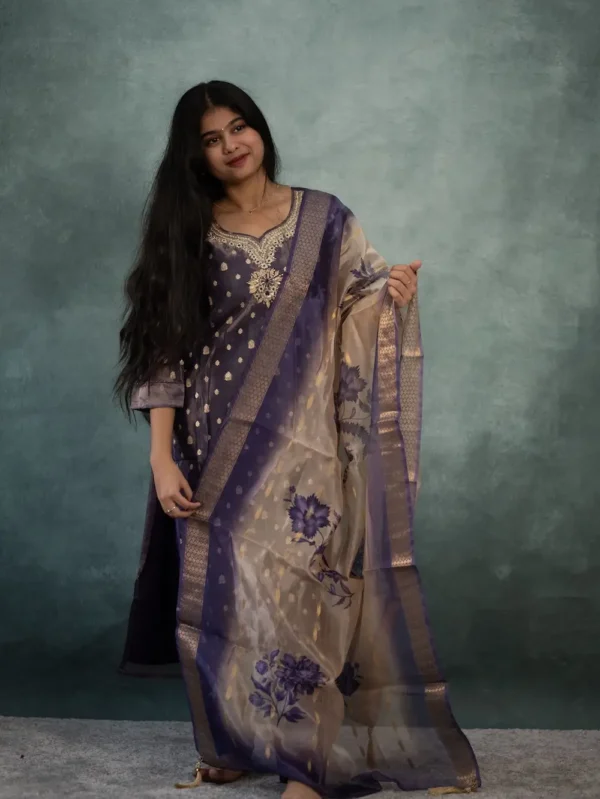 silk suit set with heavy hand embroidery on the neckline, 3/4th sleeves, and a Banarasi silk dupatta with zari weaving